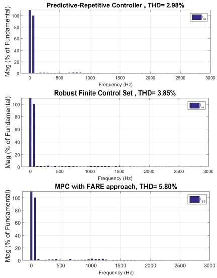 Besides the step response and the settling time, the total harmonic distortion for stator current (THDi) is also an important variable to take into account when the performance of the controllers is evaluated. It is well known that a lower value of the THDi obtains a satisfactory performance of the controller and a minimal THD. Computation of the THDi stator currents for all controllers is compared in Figure 13, at the top of this, appears the PRC, at the middle, the robust finite control set, and at the bottom the MPC with the FARE approach. In all cases, the THDi results in , , and , respectively. Again, the proposed PRC has better performance due to its lower THDi.