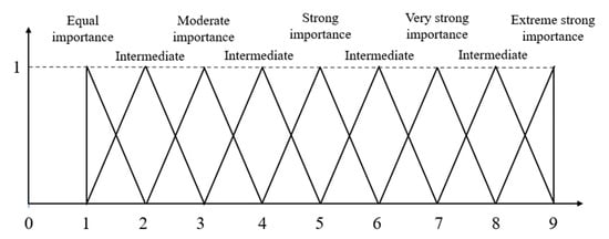 Fuzzy set theory was introduced by Zadeh to deal with vague, imprecise, and uncertain problems []. Fuzzy decision-making is a rational decision-making method that considers human subjectivity. In a fuzzy environment, linguistic variables are transformed into TFNs, which take the ambiguity and uncertainty of expert judgment into account []. By integrating TFNs into AHP, decision-making processes can be described more accurately.