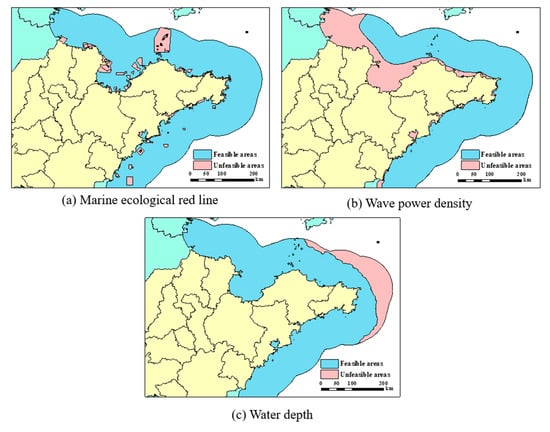 To maintain marine ecological health and security, China has designated important marine ecological function areas as key control areas; these are called “marine ecological red line” (MERL). All development activities that might affect ecosystems are prohibited or restricted in MERL areas []. Considering these restrictions and environmental factors, areas covered by MERL are excluded for wave energy development.
