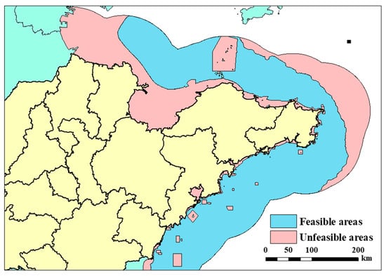 GIS is an information system used to deal with data, maps, and spatial information []. GIS tools can support planning and decision making in site-selection problems [,,,]. In this study, GIS is used to exclude unfeasible marine areas by three exclusion criteria related to economic, technical, and social constraints. Inverse distance weighted (IDW) interpolation and Euclidean distance in GIS are used to obtain 100 m × 100 m raster datasets of WPD, WD. After obtaining the raster data of the exclusion criteria, the Boolean overlay operation is employed in the overlay analysis in GIS to exclude unfeasible areas. After that, islands feasible for constructing wave power plants are identified for subsequent study.