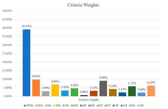 To reduce subjective deviations and improve reliability, some researchers have attempted to improve traditional AHP by integrating it with other approaches. Integrating fuzzy theory with AHP can determine criteria weights by considering fuzzy linguistic variables from decision-makers. Sánchez-Lozano et al. expressed expert-group opinions using triangular fuzzy numbers (TFNs) and then used them in the AHP method []. Ayodele et al. proposed interval type-2 fuzzy AHP, which reduces uncertainty in decision-making processes [,]. A few researchers have combined subjective and objective weighting methods to determine criteria weights; this approach can not only consider subjective expert judgment but also reflect information in the data itself [].
