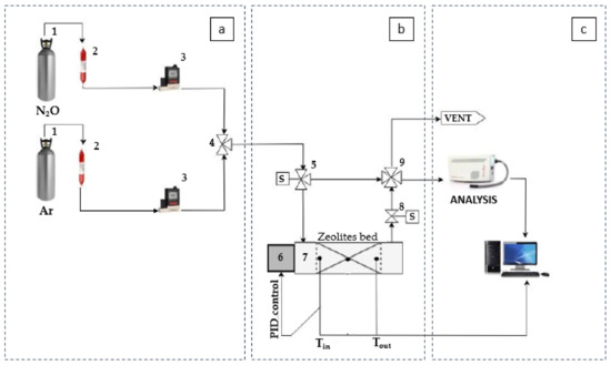 Nitrous oxide is a colorless, non-flammable and non-explosive gas. It is a minor component of the Earth’s atmosphere, having an active part in the planetary nitrogen cycle, but during last decades, its concentration has undergone a rapid increase [1] with an annual growth rate of 0.2–0.3% [2]. N2O is a powerful greenhouse gas (GHG), with a global warming potential about 300 times than the CO2; however, because of its low concentration with respect to carbon dioxide, its contribution to the greenhouse effect is underrated [3]. Recently, N2O has been reported to participate in the depletion of the ozone layer in the stratosphere, too [4,5]. Since 38% or more of the N2O present in the atmosphere is the result of human activities [6] such as agriculture, chemical processes (production of adipic and nitric acid), energy industry and transportation, N2O abatement in industrial production’s tail gas has become imperative. Compared to other removal methods, adsorption is considered attractive in particular for its low costs [7] and high efficiencies [8], and it is a promising way in the capture and recovery of N2O both with high and low concentrations [9]. A suitable adsorbent must combine several characteristics, including high equilibrium adsorption capacity, fast kinetics of adsorption–desorption and high selectivity for N2O. From literary studies, it has been found that activated carbons (ACs), carbon nanotubes (CNTs) and different typologies of zeolites are good adsorbents for N2O capture. ACs have shown good adsorption properties due to their high surface area and pore volume [9,10]. CNTs have shown good chemisorption properties, resulting, especially if doped with Pd, in excellent materials for the detection of N2O but not for its removal from tail gases through desorption [11]. Regarding zeolites, they can have different structures and compositions that ensure a different capability of creating adequate nanospace and suitable microenvironments to accommodate high loading of specific molecules [12]. Among the different typologies, the zeolites ZSM-5, 5A and 13X show the best adsorption capacity toward N2O, also in the presence of water [2,7,13,14,15,16,17]. In particular, the 13X zeolites, besides having a well-known good adsorption capacity toward N2O, as highlighted by the previous literature studies, show also good thermal [18] and dielectric [19] properties. Representing an optimum in composition, pore volume, and channel structure [20,21,22,23], the dielectric losses are significant, and microwave heating is effective in 13X zeolites. MWs allow to directly heat the solid adsorbent [24,25], so they enable to reduce the flow rate of the purge gas and possibly the regeneration time. In this way, the desorbed gas molecules released in the core of the adsorbent bed diffuse toward the lower temperature region more promptly: since the diffusion toward the surface is the rate-determining step in the desorption process, this last is favored during microwave irradiation [26,27,28].