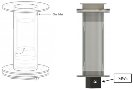 In this configuration, the gas enters from the top, passes through the inner interspace, and then enters in the adsorber from the bottom. The internal section, in which the zeolites 13X were placed, has the diameter of 6.5 cm and is 7.5 cm long. Furthermore, to minimize leaks and prevent the gases from returning in their path and damaging the magnetron, a special rectangular slot has been designed inside the flange: in it was housed a quartz plate, transparent to microwaves, which separates the magnetron from the adsorber.