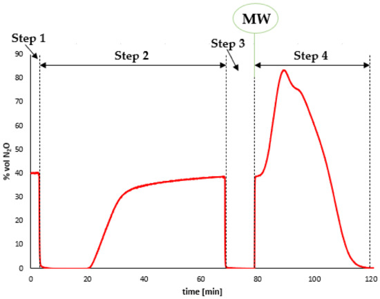 The microwave heating system has been set in automatic mode, with a cyclic operation: for four seconds, it supplies the power, and for two seconds, it sets the power to zero. Once the set point value for the Tin has been reached (Tsp = 320 °C), the system adjusts the power in order to keep this value constant. The operating conditions used for the dry adsorption and desorption tests of N2O are shown in the following Table 2.