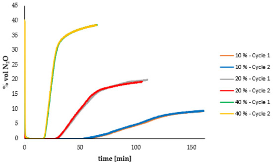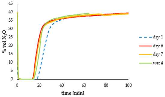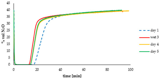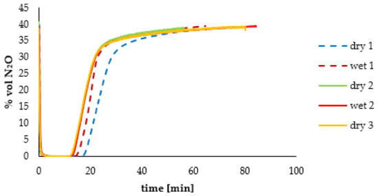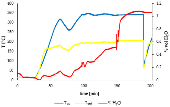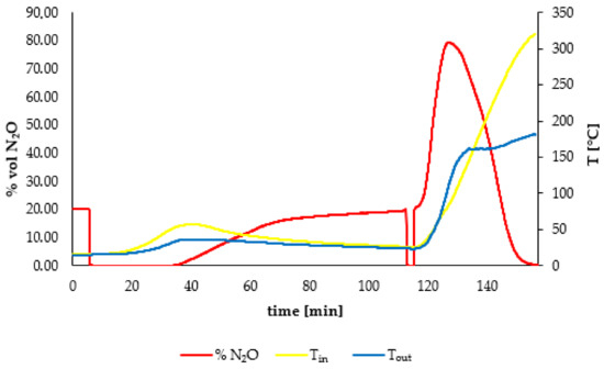 The N2O concentration and the temperature profile over time for a test taken as an example (the dry1 test) is shown in Figure 13. In particular, the inlet temperature results are higher than the outlet ones for the particular path of the fresh and cold feeding gas, as described in the previous section.
