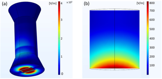 A first simulation has been carried out activating only the Electromagnetic Waves physics, in order to evaluate the distribution of the electric field into the adsorber filled with zeolites. By applying a constant MW power of 400 W, the results are shown in Figure 14.