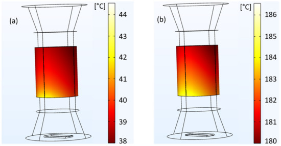 As can be seen from Figure 14a, the electric field has a great intensity near the inlet port of the microwaves, with values around 4 × 103 V/m; then, raising along the adsorber, it decreases gradually. Looking at the volume distribution of the electric field (Figure 14a), at the adsorber’s restriction and at the beginning of the zeolite’s bed, the electric field undergoes an intensification, which is evident through the two lighter stripes around 1–1.2 × 103 V/m and, in the zeolites bed it, as it is highlighted in the section view. Instead, focusing on the distribution of the electric field inside the zeolite’s bed, the values of the electric field range from 100 to 800 V/m, as shown in Figure 14b. After this first evaluation, also, the heat transfer in solids and heat transfer in fluids physics have been coupled to the RF physic. The temperature results returned by the simulations well fitted the experimental ones: in fact, the same temperature increase in the same time interval has been obtained. The inlet temperature of the solid goes from the initial temperature of 20 °C to 44 °C after 5 min and reaches 185 °C after about 25 min (Figure 15), denoting a temperature ramp of about 9 °C/min (Figure 13).