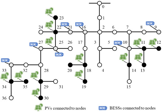 To validate the effectiveness of the proposed control algorithm, the control algorithm is implemented in a modified IEEE 37-bus system, as Figure 1 shows. In this system, fourteen distributed solar generation units and seven BESS are installed. The corresponding specifications can be summarized as shown in Table 1. In the simulation, the system is separately operated by the centralized control and the proposed distributed control schemes.