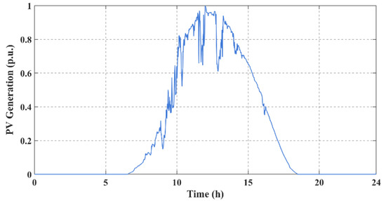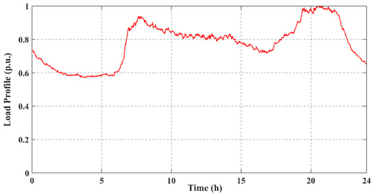 In this case, the PV generation is distributed in the system, and their generation profile can be shown in Figure 2. Meanwhile, the load profile also varies [26], as shown in Figure 6. The simulation is performed for 24 h. The neighboring nodes exchange information and update their local control reference every 1 min. The simulation is performed repetitively for three cases, including the case without BESS, the case with BESS under the centralized control scheme, and the case with BESS under the distributed control scheme.