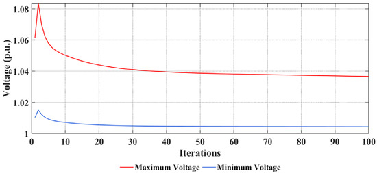 The change in the maximum and minimum system voltage with respect to the iterative steps can be plotted as shown in Figure 3. Figure 4 shows the convergence of the total distribution loss and cost with respect to the iterative process. As analyzed in [25], the theoretical convergence rate is . The computation time of 100 iterations is about 0.70 s, which is satisfied the system operation requirement [21]. Figure 5 shows the eventual nodal voltages of the system after the iteration process. When the proposed control is not applied, nearly 30% of the nodal voltages exceed the limits. However, the nodal voltage is within the safety requirement when the proposed control method is applied. This proves that the proposed control method can effectively operate the BESS to regulate the bus nodal voltage against the interruptive PV generation.