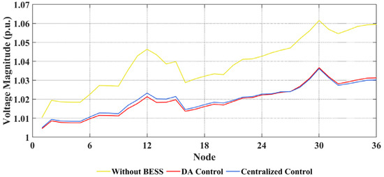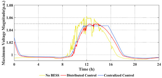 - When BESS is not installed, during the period of 11:00–14:00, the PV generation exceeds the load demand, and the nodal voltage surges and keeps exceeding the maximum for nearly 13% of the day. When BESS is installed, it can buffer the excessive PV power for regulating the nodal voltage within the safety range, proving the necessity of installing the BESS. Besides, the distributed control scheme can have nearly identical performance in bus voltage regulation compared with the centralized method;