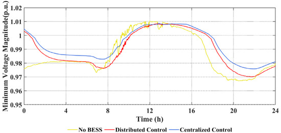 To demonstrate the dynamic performance of the control algorithm, the 24 h maximum and minimum voltage magnitude profiles are plotted as shown in Figure 7 and Figure 8. Combined with the PV generation profile and load profile, it can be concluded that