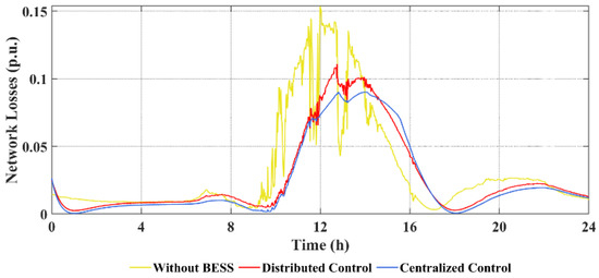 The network losses under three scenarios are shown in Figure 9. By comparison, it can be found that network loss of the cases with and without BESS is significantly different, especially when the PV generation is at the fastigium (10:00–15:00). When BESS is not involved, the maximum loss is up to 150 kW. When BESS is involved in the voltage regulation process, the power loss is much smaller. Compared to the case without BESS, the network loss is significantly reduced, with a maximum reduction in nearly 50%. This is due to the involvement of the BESS alleviating the overvoltage caused by the PV overgeneration. Moreover, the BESS effectively confines the voltage drop to the safe range, thus reducing the network loss.
