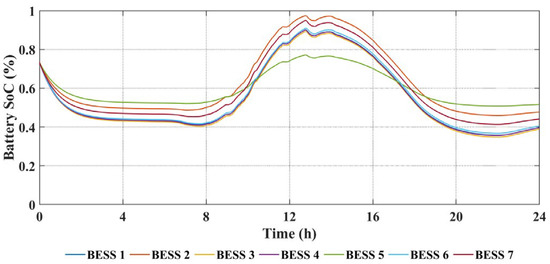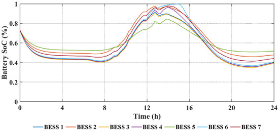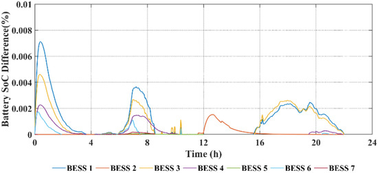The BESS SoC daily profiles with centralized and proposed algorithms are shown in Figure 10 and Figure 11, respectively. The SoC difference between the two algorithms is shown in Figure 12. By comparison, it can be found that: