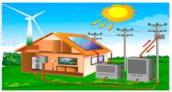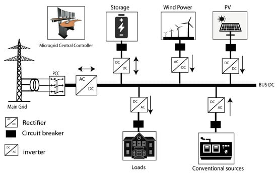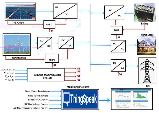Figure 4. All renewable energy sources integrate the DC bus’s electrical power and use the inverter, and power is always available for the AC loads. Solar and wind power sources are the primary source for the home. The battery storage system (BSS) guarantees the balance at the microgrid between the produced energy and the loads required.