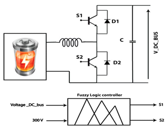 The converter employed in this study is a half-bridge IGBT with continuous conduction operation (CCM). The converter functions in boost mode; it operates in buck mode when storing excess energy at the DC bus. S2 and D1 are active in boost mode, and current flows to the DC bus. S1 and D2 are active in buck mode, and power flows to the battery [
