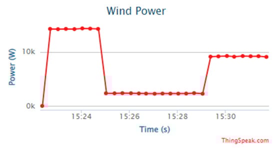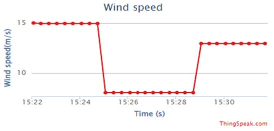 Figure 11 shows the wind speed profile proposed for this simulation. At the start of the simulation, the wind speed was stable at 15 m/s, then decreased to 8 m/s, and at t = 15:29 increased to 14 m/s.