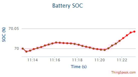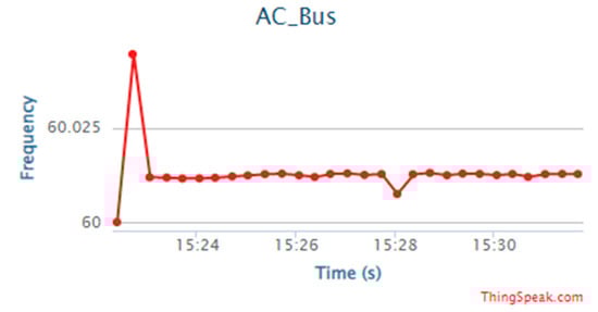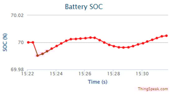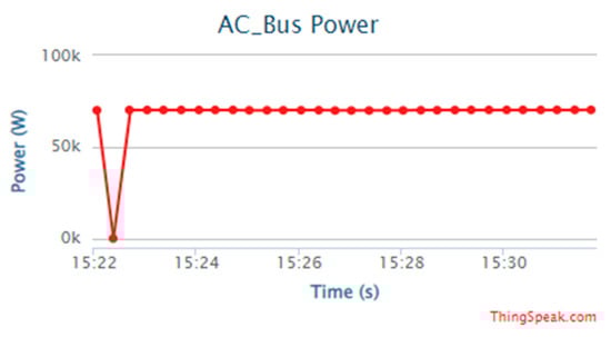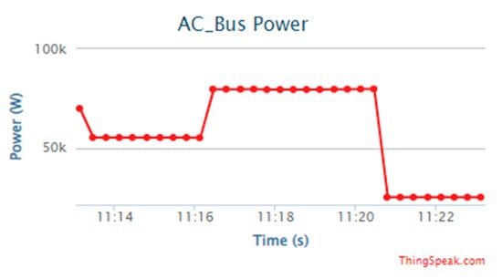 The simulation runs for 7 s with a 1 × 10−5 sample period to show how the suggested energy management method responds to weather conditions and load demand in the microgrid balance. The monitoring platform displays the variation from each source at the moment of access to the webpage, with results updated every 5 s. Next, this section will discuss results obtained from the ThingSpeak platform.
