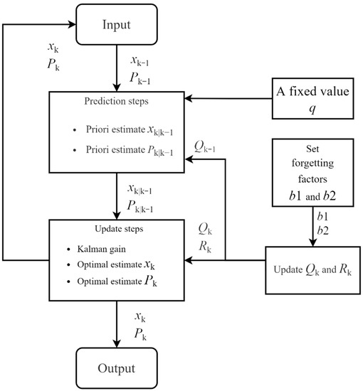 Combined with the above and Figure 4, it can be concluded that, compared with the previous algorithm, the calculation of and is cancelled, and the original forgetting factor is replaced. Instead, two forgetting factors and are set for the update of and respectively. Meanwhile the system noise is rederived by a series of approximate processing in the steps.