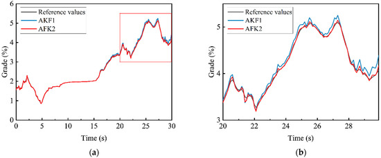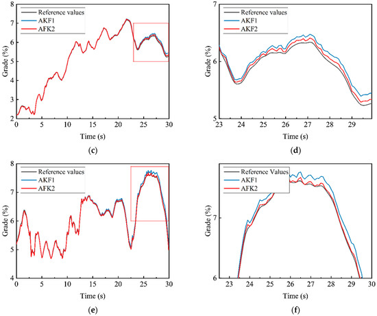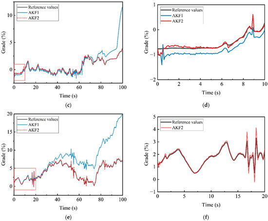 In this paper, AKF1 represents the initial adaptive Kalman filter algorithm, and AKF2 represents the improved adaptive Kalman filter algorithm. The black solid line is used to represent the reference measured road slope value, the blue solid line is used to draw the data results of the original adaptive Kalman filter algorithm, and the red solid line is used to draw the data results of the improved adaptive Kalman filter algorithm. In order to compare the two algorithms more clearly, some regions in the Figure 7 are enlarged and displayed on the right side of the original line chart. The RMSE and MAE of the algorithm results are drawn into tables, as shown in Figure 8.