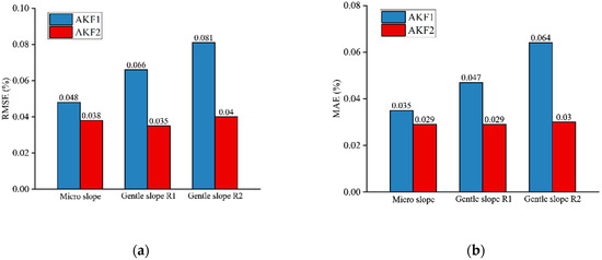 - After a comprehensive comparison of the results of the two algorithms above, it can be found that, compared with the results of the original adaptive Kalman filter slope estimation method, the RMSE and MAE of the improved algorithm are significantly reduced. The RMSE of the micro slope model is reduced by 0.01%, which is 20.8% lower than the original algorithm. The MAE of the micro-slope model is reduced by 0.006%, which is 17.1% lower than the original algorithm. The RMSE of the gentle slope model R1 is reduced by 0.031%, which is 47% lower than the original algorithm. The MAE of the gentle slope model R1 is reduced by 0.018%, which is 38.3% lower than the original algorithm. The RMSE of the gentle slope model R2 is reduced by 0.041%, which is 50.6% lower than the original algorithm. The MAE of the gentle slope model R2 is reduced by 0.034%, which is 53.1% lower than the original algorithm. The error of the 100 s filtering result of the algorithm proposed in this paper increases to some extent compared with the previous 30 s filtering result. However, the error is still reasonable. In conclusion, the improved adaptive Kalman filter slope estimation method is superior.