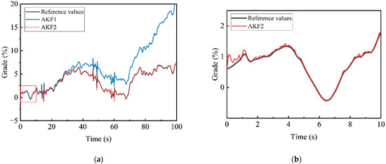 Compared with the DUKF algorithm proposed by Jin et al., the algorithm proposed in this paper has a faster convergence speed [2]. It can be seen from Figure 9 that the convergence time of the algorithm in this paper is less than 4 s, compared with the convergence time of the DUKF algorithm of about 7 s. Within the scope of adaptive Kalman filter, the convergence speed of the algorithm proposed in this paper is faster than the AEKF algorithm proposed by Liao et al. and the AUKF algorithm proposed by Sun et al. [24,25]. In the experiment of AEKF slope estimation method proposed by Liao et al., the distance was taken as abscissa and the slope was taken as ordinate to output filtered images. It can be seen from the literature that the algorithm converges when the driving distance is about 100 m, and the convergence speed is slow. The convergence time of the AUKF algorithm proposed by Sun et al. is about 10 s, which is longer than the convergence time of the slope estimation method proposed in this paper. Therefore, this algorithm has obvious advantages in the starting stage of electric vehicles. In the starting process of pure electric vehicle, the system directly controls the motor output torque to make the vehicle start normally. When electric vehicles start, if the output torque does not adapt to the starting slope, too much output torque may lead to vehicle running forward in small slope, while too little output torque may lead to vehicle sliding behind or insufficient starting power in large slope. Therefore, the slope algorithm proposed in this paper can improve the smoothness at the start time of EV autonomous driving.