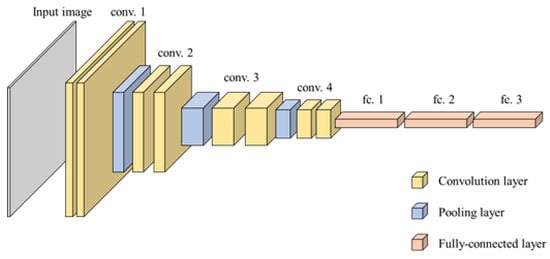 The pooling layer receives the output data of the convolution layer as the input and reduces the dimension of the feature map. The pooling technique is classified into max pooling that extracts the maximum value from a certain part of the feature map, min pooling that extracts the minimum value, and average pooling that extracts the average value. Max pooling is mainly used, rather than min pooling or average pooling, under the assumption that strong features are expressed when the pixel value is large []. If the convolution layer and the pooling layer are repeated, the image data are transformed into a shape that is difficult to recognize with the naked eye, but a feature map is output that extracts only the important features of the data. The fully connected layer lists the finally obtained feature map as one-dimensional vector data and outputs the final predicted value after going through the activation function.