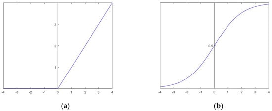 The feature map finally calculated in the convolution layer is not transmitted directly to the next layer, but only after passing through the activation function. All operations performed in the convolution layer are composed of linear functions. That is, even if the convolution layer is repeated infinitely, it is limited in solving nonlinear data problems unless nonlinearity is forcibly applied. To learn both linear and non-linear data, the process of adding non-linearity through an activation function is essential. For activation functions, ReLU and Sigmoid functions were used. Equations (1) and (2) and Figure 2 were defined by comparisons with other functions, so that the ReLU function had the advantages of fast learning, low computational cost, and very simple implementation. This function can solve the vanishing gradient problem, because it outputs 0 when the value of  is 0 or less, and a constant gradient value when it is positive []. The sigmoid function outputs a value between 0 and 1 according to the x value, and outputs a negative value as a value close to 0 [].