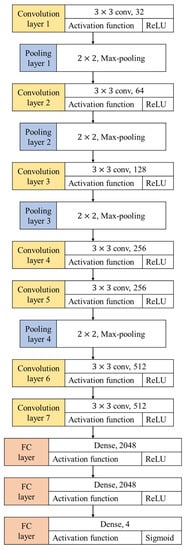 The constructed CNN model is shown in Figure 5. This network consisted of seven convolution layers and four pooling layers, and the size of the convolution layer filter was (3, 3), which was the same for all. The CNN also had a structure in which the gradient and the pooling layer were repeated. The ReLU activation function was applied to solve the loss problem in the convolution layer. In the pooling layer, the maximum pooling technique of size (2, 2) was applied; in the output layer, a sigmoid function was used, and the learning rate was set to 0.0001. In addition, the Adam optimizer was used as an algorithm for learning, and all codes were written based on Tensorflow 2.7.0 and Keras 2.7.0. As the computing environment used in this study, the CPU was an AMD Ryzen 7 3700X, GPU was ab NVIDIA GeForce RTX 2080 TI, and RAM was 64 GB.