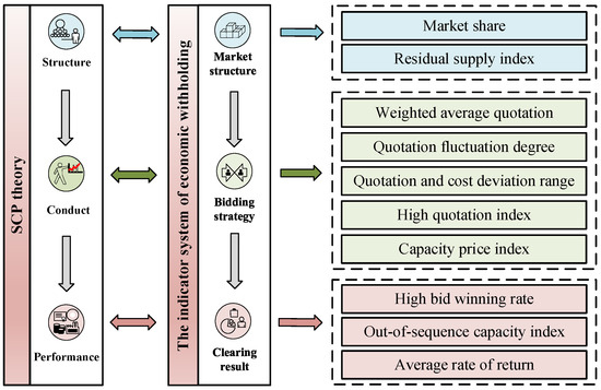 Based on the SCP theory in industrial economics [29], an indicator system for identifying economic withholding behavior of the generators is constructed. In SCP theory, there is a causal relationship between market structure, behavior, and performance. To obtain the ideal market performance, it is necessary to adopt active government control, improve market structure, and regulate market behavior.