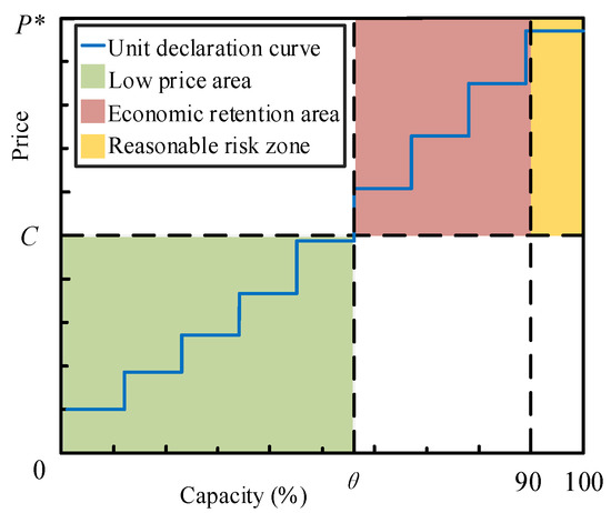 The normal operation reserve of a power system is approximately 90%. Therefore, when the load exceeds the first 90% of the declared capacity and enters the last 10% of the remaining capacity range, it indicates that the load supply is tight. At this time, the electricity spot market begins to fall short of demand and transforms into an imperfectly competitive market. Risky psychology will drive the generator to report a high price in the final declared capacity. Therefore, even if the generator reports a high price in the final remaining capacity range, it can be considered reasonable [34]. A diagram of the price declaration interval for generators is shown in Figure 2.