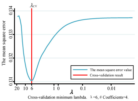 Next, we combine Equation (23) and the SCAD penalty regression method to eliminate multi-collinearity and perform variable selection. According to ref [42], the aforementioned formula is considered negative, and the penalty function is added to transform it into a Lagrange’s equation:
