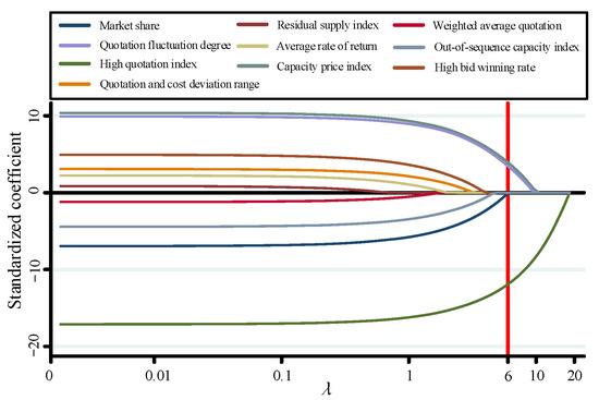 The logit model can identify market power abuse, such as economic withholding, in multiple fields. Ref. [21] constructed an identification model of listed financial risks of the companies based on a logit model. Ref. [22] constructed a multivariate binary logit Early Warning Model for systemic banking crises. Compared with other identification methods, the logit model can provide model explanations and obtain the impact size of various indicators [23]. The transaction data of the electricity spot market are complex and high-dimensional. This study combines variable selection methods to improve the performance of the logit model. In existing research, variable selection methods primarily include the shrinkage method, dimensionality reduction method, and smoothly clipped absolute deviation (SCAD) penalty regression method [24]. This paper adopts the SCAD penalty regression method, which can remove variables with similar characteristics, thereby eliminating the collinearity between indicators and reducing the data dimension [25].