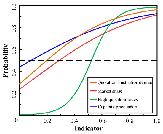 where C is the average power generation cost, which is usually replaced by the average on-grid price of the previous year. In fact, taking a value near the average power generation cost will not significantly impact the high quotation index. Equations (10) and (11) are the constraint conditions of and , respectively. At time t, we take the declaration section for generator i in the market. The declared electricity price of the section is greater than the average power generation cost, and the sum of the declared capacity of the section and its previous sections is less than 90% of the available capacity.