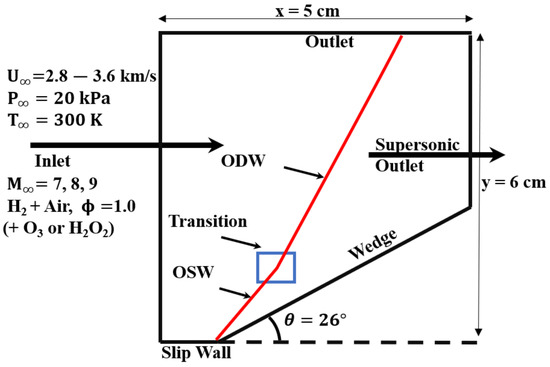 Figure 1 also shows the boundary conditions used for all the simulations. The left boundary is used as the inflow boundary condition with appropriate pressure, temperature and inflow speed along with the species assigned, as shown in Table 1. The freestream pressure of 20 kPa and a temperature of 300 K have been used for all the simulations with a fixed wedge angle of 26°. All the time-dependent simulations were initialized with impulse start and stopped at 100 s, which was found as a sufficient time interval for the stable oblique shock wave or oblique detonation wave formations. The end solution was analyzed for abrupt and smooth transition patterns, as well as initiation length for the oblique shock to detonation wave transition. The careful choice of Mach number, freestream pressure and temperature conditions results in the selection of a domain (wedge length) to perform the simulation with an adequate grid resolution for the available resources.