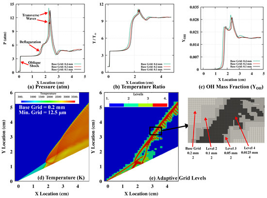Figure 2 shows results from the grid independence study performed for freestream Mach 7 for the and air mixture with a 10,000 PPM addition. Figure 2a–c show the variation in pressure, temperature and mass fraction along the line parallel to the wedge length (with a 0.2 mm shift). Figure 2d shows the temperature contours for the abrupt transition of the established detonation wave, and Figure 2e shows the used adaptive grid refinement levels (up to 4) in the simulation for a medium grid. The pressure curve in Figure 2a shows the sudden rise in the pressure near the wedge tip, representing the oblique shock wave and the second rise due to ignition and deflagration wave in the compressed region. The next jumps represent the transverse waves in abrupt transition. A similar profile is also seen for temperature variation along the wedge in Figure 2b. The variation in mass fraction represents the chemical activity, while pressure and temperature variations represent the gas dynamics structures captured through numerical simulation. All three base grid solutions are able to capture the gas dynamic features of abrupt oblique detonation waves from pressure and temperature curves, as well as chemical activity from the mass fraction curve. The coarse grid (base grid 0.4 mm) shows a slight early rise in the deflagration and detonation zones, but medium and fine grids have shown similar initiation structures without significant difference in the gas dynamic and chemical effects. Hence, the medium grid (base grid 0.2 mm) is selected for all of the calculations. The temperature contours are shown in Figure 2d, which clearly captures the oblique shock and abrupt transition through the deflagration zone, triple point, transverse wave, slip line and reflected transverse wave, as well as detonation pattern. Figure 2d shows the four levels of adaptive grid refinement used at time t = 100 s. The used adaptive refinement criteria based on pressure and density, as well as species, were found to be adequate to capture the main features of ODW abrupt transition. The representation of different levels of refinements is shown in the zoomed image in Figure 2e. The minimum grid size for the medium grid (base grid 0.2 mm) with level 4 adaptive grid refinement is 12.5 m, which represents approximately 25 grid points in the CJ-ZND induction length for 10,000 PPM addition. Although, with an overdriven detonation wave at higher Mach numbers, the ZND induction length will be smaller than the CJ-ZND induction length. However, within the scope of the study, all three grid resolutions are able to capture the required detail to estimate the ODW initiation length and pattern adequately. Moreover, another deciding factor for choosing the medium grid solution was computation cost. The single medium grid solution uses approximately 2800 core hours, while the fine grid solution used approximately 12,000 core hours.