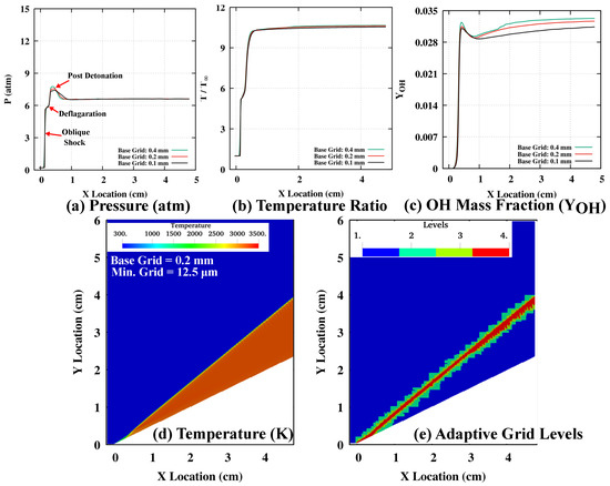 Mach 9 with 10,000 PPM addition: (a) Pressure, (b) temperature and (c) mass fraction variation at lines parallel to the wedge for all three grids; (d) Temperature and (e) adaptive grid levels for a medium grid.