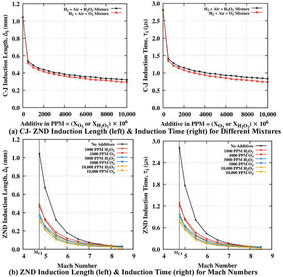 Induction Length () and Induction Time () variation with (a) Additives, based on CJ-ZND calculation (b) Mach number, based on overdriven ZND calculation.