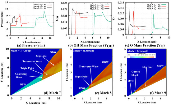Various flow features are mentioned for Machs 7 and 8 abrupt transition and Mach 9 smooth transition in Figure 5d–f. At Mach 7 abrupt transition, the triple-point separates OSW and ODW and the front coalesced wave and transverse wave forms a -shape shock pattern. An unstable slip line with roll-up behavior of the K-H instability in the detonation zone, along with a reflected transverse wave, is also captured at the abrupt transition. The simulations also show detonation cell-like structures in ODW. Qualitatively, the above numerical simulation result at Mach 7 captures a non-reactive initiation zone, deflagration waves and oblique detonation wave experimentally visualized by Viguier [4]. Recently, Zhang et al. [44] have also reported clear experimental flow features captured from an ODWE model experiment in a hypersonic wind tunnel ( = 6.6), with the abrupt transition termed as the strong ODW mode. The oblique detonation wave forms as an oblique Mach stem due to the confined space. These results confirm the presence of a triple point and transverse wave in the experiment, similar to flow features obtained in the above numerical simulation shown in Figure 5d. At Mach 8 (Figure 5e) also, an abrupt transition was observed with a triple point dividing the OSW and ODW and with weaker coalesced and transverse waves (than Mach 7) behind the initiation zone. The angle of ODW has been reduced at the higher Mach number 8 when compared to Mach 7. At Mach 9 (Figure 5f), the triple point has almost disappeared, and a smooth transition occurs with the curved shock and transverse wave disappearing, while the slip line behind the initiation zone becomes parallel to the wedge. The weak detonation result reported by Zhang et al. [44] shows a smooth transition of OSW to ODW with the absence of a triple point and the formation of a series of compression waves transitioning to an oblique detonation wave. Similar flow features are observed in the smooth transition obtained at Mach 9 (in Figure 5f). The oblique detonation wave angle becomes smaller in the weak (smooth transition) ODW mode compared to the strong (abrupt transition) ODW mode from experiments. Table 2 compares the theoretical and numerical ODW angles for the simulated conditions. The theoretical ODW angle is obtained assuming post-shock equilibrium conditions with relation and a fixed wedge angle (=) 26°. At Machs 7 and 9, the ODW angles match well with the theoretical values; however, there is a small difference in theoretical and numerical ODW angles at Mach 8. It is evident here that the OSW to ODW transition may occur abruptly at lower Mach numbers for fixed wedge angles and premixed mixtures. However, high Mach numbers show smooth transitions with a smaller initiation length. The initiation length is quantified here from the intermediate atom peaks along the wedge surface. The axial initiation length at Mach 7 is observed as 6.5 cm (beyond 4.8 cm wedge), and it is estimated as 1.70 and 0.69 cm at Mach 8 and 9, respectively. In the next sections, the effect of chemistry is evaluated on OSW to ODW transition by adding and of up to 10,000 PPM in premixed –Air mixture (at ).