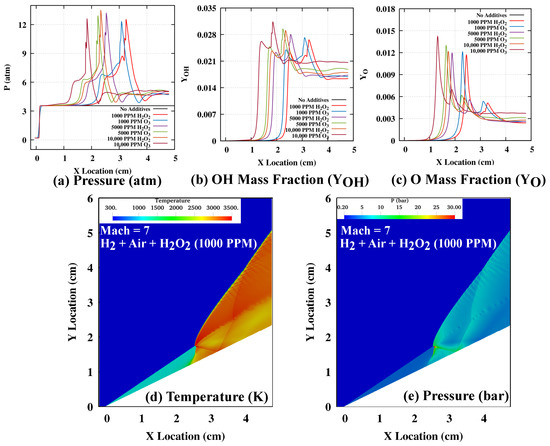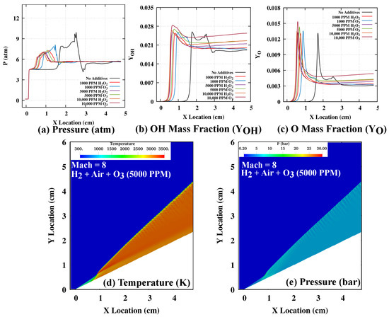 The preliminary ZND calculations for CJ speed in Figure 4 show that a small amount, such as 1000 PPM addition of and , can significantly reduce the induction zone length and induction time by ignition promotion. On the one hand, ozone can be easily decomposed into and atoms at all concentration levels by the third body reaction. The atom in the induction zone accelerates the chain branching process, which leads to a reduction in the ignition time delay. On the other hand, hydrogen peroxide can be readily decomposed into 2 hydroxyl radicals by third body reaction, leading to rapid temperature rise and reduction in the ignition time delay. At Mach 7, we can assume that a wedge with a finite axial length of 4.8 cm could not establish the ODW (the axial initiation length is 6.5 cm, as shown with the larger domain simulation in the previous Section 3.1). The numerical simulations are performed for 1000, 5000 and 10,000 PPM addition of and at this Mach number. In order to understand the chemical effect of additives on ODW formation, the mass fraction of intermediate species, and , are plotted along the wedge axial length in Figure 6b,c. Pressure variation along the wedge (Figure 6a) and temperature (Figure 6d), and pressure contours (Figure 6e) are plotted to understand the gas dynamics effects. With the small amount (1000 PPM) of and added, the oblique detonation wave stabilizes on a finite length wedge with a 2.45 cm axial initiation length (62% reduction). Both and addition shows similar profiles to and mass fraction variation in Figure 6b,c. However, the OSW to ODW transition remains abrupt in nature with a -shock pattern for both additive cases of 1000 PPM and , which is clearly reflected as double peaks in pressure, and mass fraction plots, as well as temperature and pressure contours for 1000 PPM addition. The further addition of 5000 and 10,000 PPM additives reduces the initiation length to establish the ODW, but the nature of the transition does not change. The intermediate species mass fraction, as well as pressure curves, show similar profiles but a shift in the axial direction. The higher additions of and show a slight difference in their effectiveness. The addition further reduces the initiation length in comparison to the same amount of addition. It can be understood that decomposition is prevalent even at lower compressed temperature and pressures (in comparison with higher Mach numbers) after the oblique shock at Mach 7, while the formation increases at the upstream location on the wedge (2nd peak is higher in the OH profile). may require a higher temperature to decompose into . Additionally, can also increase the concentration near the end of the initiation length, which can significantly promote reactivity in the compressed region.