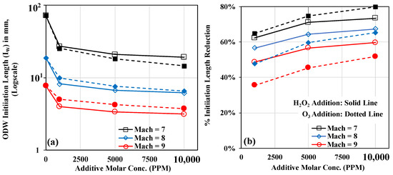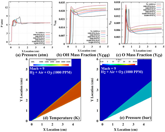 Figure Figure 9a,b quantify the effectiveness of and addition on ODW initiation length control. The initiation length () is defined as the length along the wedge surface when the peak oxygen atom (O) mass fraction occurs. The axial X distance is converted to the initiation length with the use of the simulated wedge angle of 26°. In the case of no additives, the initiation lengths computed are 7.2, 1.89 and 0.78 cm for Mach 7, 8 and 9, respectively. In the case of Mach 7, the ODW formation occurs beyond the finite wedge length (of 4.8 cm) used in the current study. As the Mach number increases from 7 to 9, the OSW to ODW transition moves from abrupt to moderately abrupt and to a smooth transition, moving towards the wedge tip. With the increase in Mach number for a fixed wedge angle, the compression by initial OSW in the initiation zone increases the pressure and temperature near the wedge tip, and the oblique shock becomes closer to the wedge surface. With the higher pressure and temperature after the oblique shock, the fuel–air mixture can achieve ignition closer to the wedge tip and leads to an abrupt to a smoother transition. Figure 9b also shows the percentage reduction in initiation length by use of a small and moderate amount of and additives. It can be observed that with a small amount of 1000 PPM, the initiation length is significantly reduced at the lower Mach 7 by approximately 62.3%, with a further increase in additive content, an addition of 10,000 PPM can lead to a maximum initiation length reduction of 80%, while 10,000 PPM of addition can reduce the initiation length by 73%. At higher Mach numbers, it can be seen that performs well in reducing the initiation lengths in comparison to the same amount of . It can be concluded that provides better performance in reducing the initiation length at higher Mach numbers or near the smooth OSW to ODW transition operation, while is a very effective ignition promoter in the lower Mach number range, and can be helpful for increasing the lower operating flight speed in detonation mode with a very small addition.