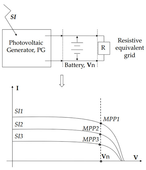 On the other hand, in [25], it has been already demonstrated that batteries, if installed in a distributed manner, can operate as a first-level distributed “passive” MPPT and can improve the energy production of conventional grid-connected PV plants, especially in the presence of mismatching conditions, so representing a valid alternative to distributed active MPPTs. In fact, a battery pack can be profitably connected in parallel with a photovoltaic submodule if one has care to properly match, as best as possible, its nominal voltage with the open-circuit voltage (under STC) of the submodule. For more details, it can be worthwhile to look at Figure 1. It shows that, in parallel with the PV generator and the network, a battery properly designed in its nominal voltage value can naturally catch and maintain a PG working point very close to the maximum power point MPP for any PG solar irradiation level and any value of the grid equivalent resistance.