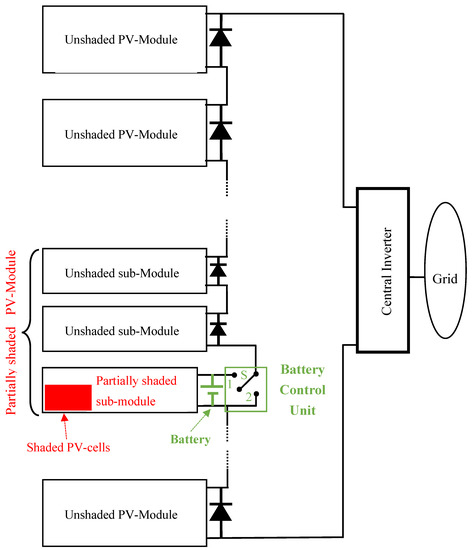 As in the previous papers [19,23,25], in this work, batteries are proposed to be utilized in a distributed manner by connecting them at the submodule level of a PV string, but only at the terminals (available within their respective junction box) of the shaded submodules. Figure 2 should give a better understanding of the proposed plant architecture.