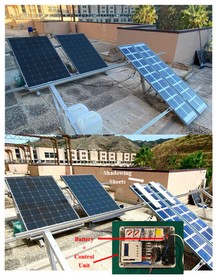 About the artificial partial shading to cope with, firstly, please note (Figure 3) that all the PV modules and the homemade submodules are south facing. Then, two opaque plywood sheets are mounted only on the two homemade submodules so that, for each submodule, only three consecutive PV cells are partially shaded. Because of the mounting characteristics of the PV modules and of the fixed opaque sheets, the partial shading is expected to be repetitive and predictable. In particular, during a single day, the partial shading level of those PV cells is expected to be: (i) low during the morning hours, (ii) very high during the central hours, and (iii) low during the evening hours. Some further details are provided in the following Section 3.2.2.