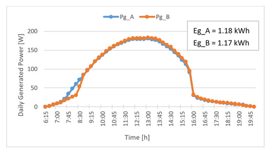 Firstly, the two PV generators, A and B, have been exposed to the sunlight without any shading obstacle or any additional component to demonstrate their almost identical daily energy generation capability. Figure 5 shows the daily power generation curves, Pg_A and Pg_B, of the two PV generators on a July 2021 cloudless day, together with their daily generated energies, Eg_A and Eg_B. Both PV generators have produced almost the same daily energy of about 1.2 kWh.