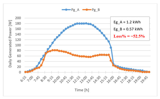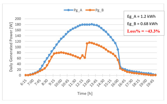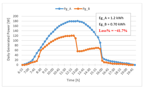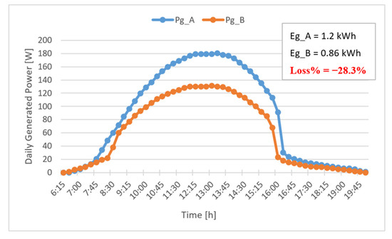 Figure 6 shows the daily power generation curves, Pg_A and Pg_B, of both PV generators A (with no shading) and B (with shading) together with the corresponding daily generated energies, Eg_A and Eg_B, and the percentage energy loss factor, Loss%, of the PV generator B with respect to the PV generator A. The experiment refers to a July 2021 cloudless day when the bypass diode of the submodule B did not intervene.