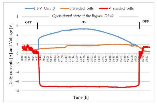 Figure 15 reports the experimental results during an August 2021 cloudless day when the bypass diode of the submodule of the PV generator B intervened early, and it remained in the conduction mode until the evening.