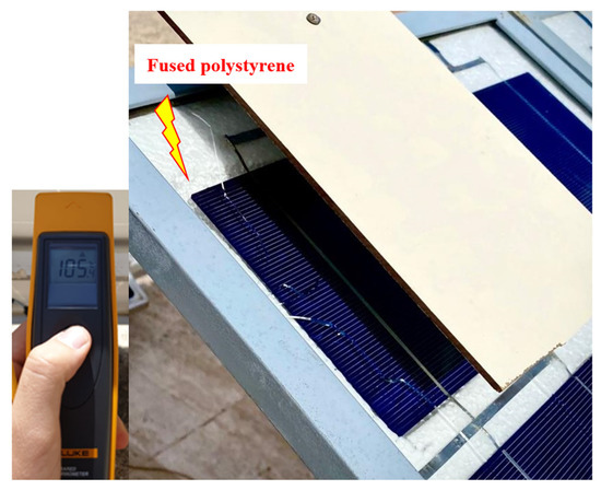 However, once this phenomenon was experimentally evidenced together with his danger level, we decided to perform an additional short-time experiment by shading in a very similar way only a single PV cell during the central hours of the next cloudless July day. During this additional experiment, we have constantly monitored the conduction mode of the bypass diode together with the reverse voltage, the current, and the temperature of the shaded PV cell; this last was measured by an infrared IR Fluke 61 thermometer. As in the previous experiment, the bypass diode suddenly entered and remained in the conduction mode, and the reverse voltage and the current of the PV cell have respectively reached the values of about −7 V and 2 A. In a small area close to a corner of the shaded PV cell, the temperature rapidly increased compared with temperatures of different areas and different PV cells; furthermore, after some minutes, it reached the dangerous value of 105 °C, just long enough for us to decide to stop the experiment to avoid damage to the homemade module; the (not tempered) glass cover was noticeably cracked while the polystyrene back sheet was also noticeable fused. The photos in Figure 11 reveal some more illustrative details.