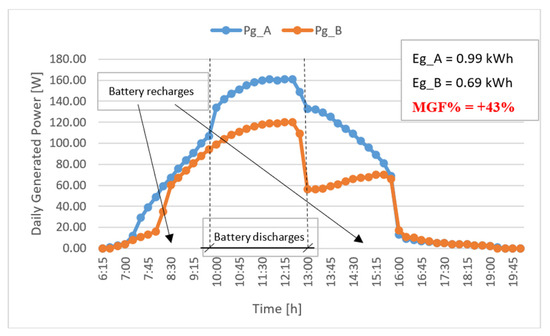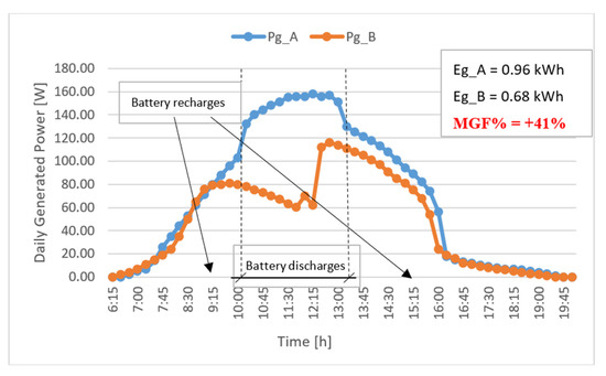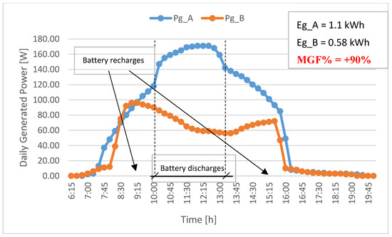 Figure 12 reports the daily power generation curves, Pg_A and Pg_B, during an August 2021 cloudless day, together with the corresponding daily generated energy values, Eg_A and Eg_B, and the consequent percentage major generation factor, MGF%, of the PV generator A with respect to the PV generator B. In this experiment, the bypass-diode of the submodule of the PV generator B did not intervene.