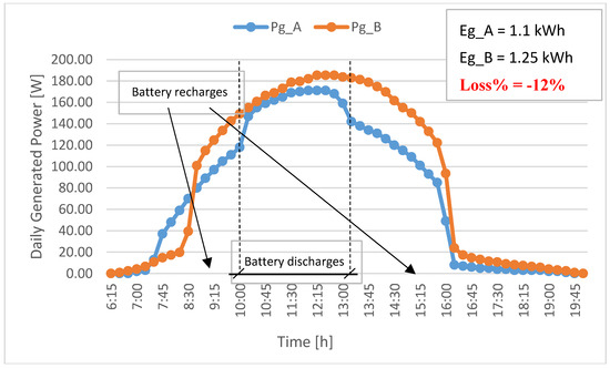 Daily power generation curves, Pg_A and Pg_B, of the two prototypal PV generators A and B, on an August 2021 cloudless day, together with the corresponding daily generated energy values, Eg_A and Eg_B, and the percentage loss factor, Loss%, of the PV generator A compared with the PV generator B. In this experiment, the three PV cells of the homemade submodules of the PV generator A are again shaded, and the battery control unit is activated, while the PV generator B is now completely unshaded.